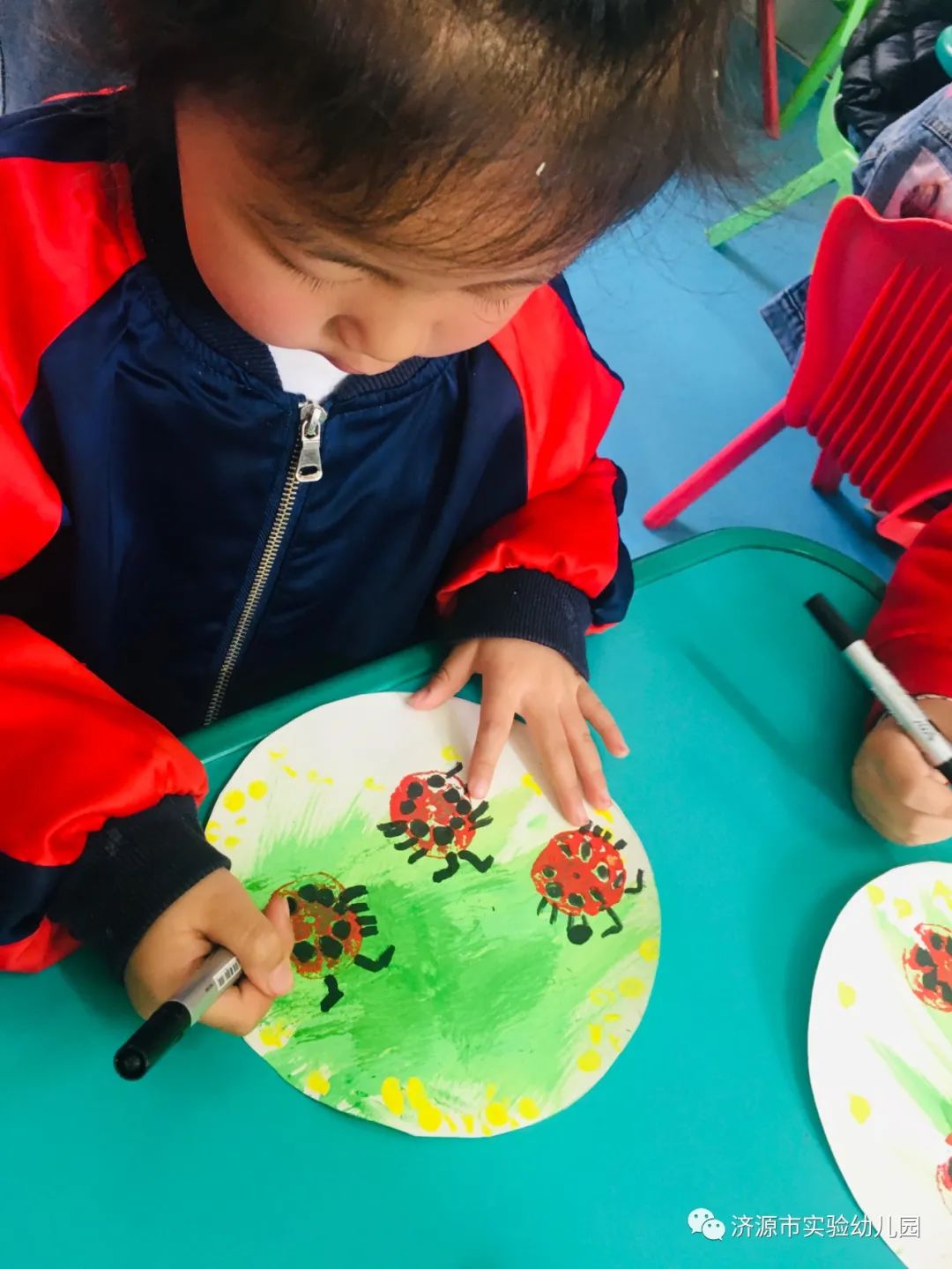 今天,创意的主角是莲藕、牙刷和颜料,看起来非常不搭的三种材料,如何在孩子们的手中变成一幅幅艺术品呢?瞧,绿色颜料是基础,用上小牙刷连续刷呀刷,变成了一丛丛茂盛的绿草;下面该莲藕出场了,切成段的莲藕在红色颜料盒子里蘸了一蘸,然后在画纸上一按,哎呀,红彤彤的圆形出现了,原来食物也可以是作画的工具;随后,孩子们拿起画笔,添画出六条腿和两个触角,一只只不同体态的瓢虫跃然纸上,再用手指点出黄色的小花,一幅幅充满童趣的七星瓢虫图就完成了。